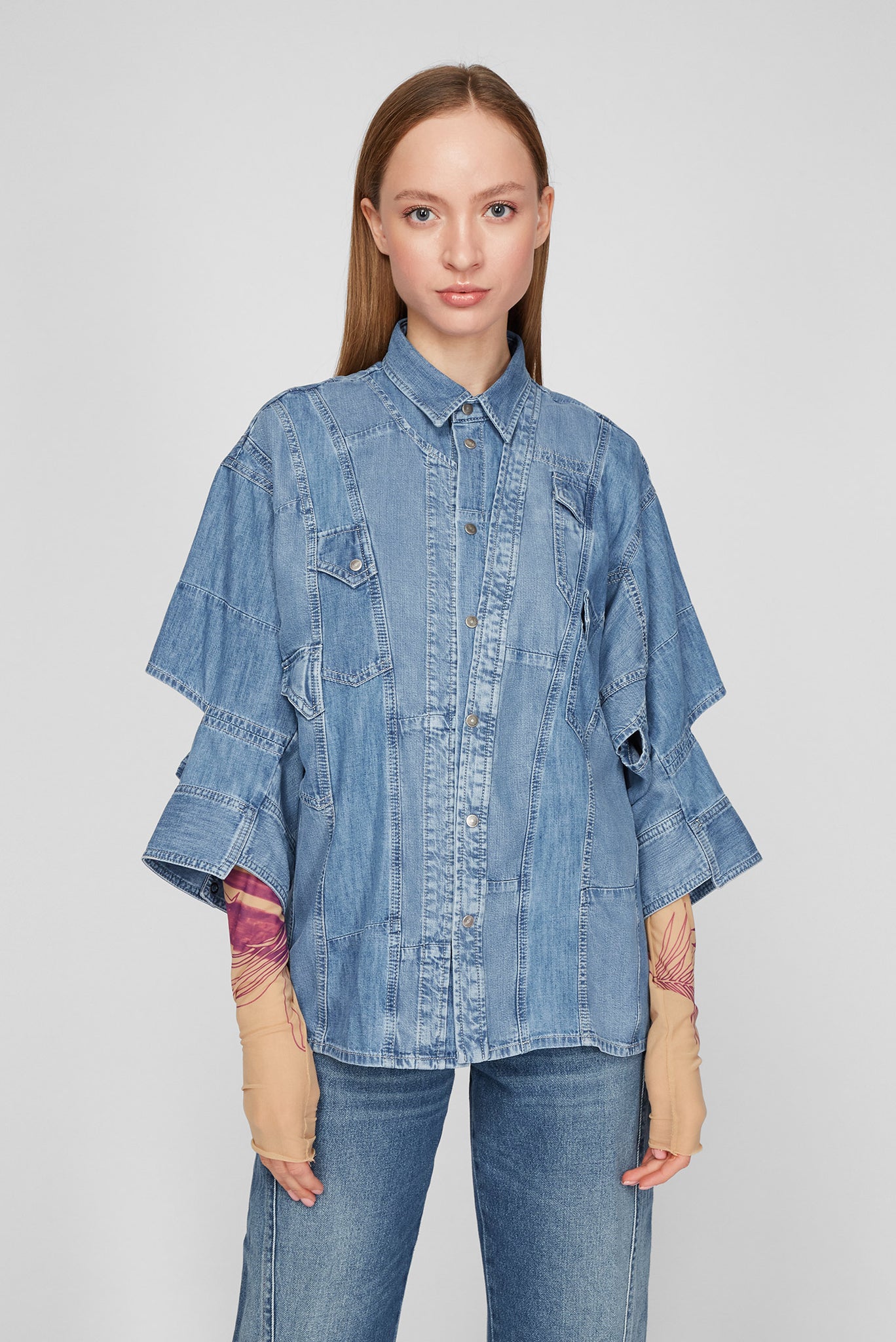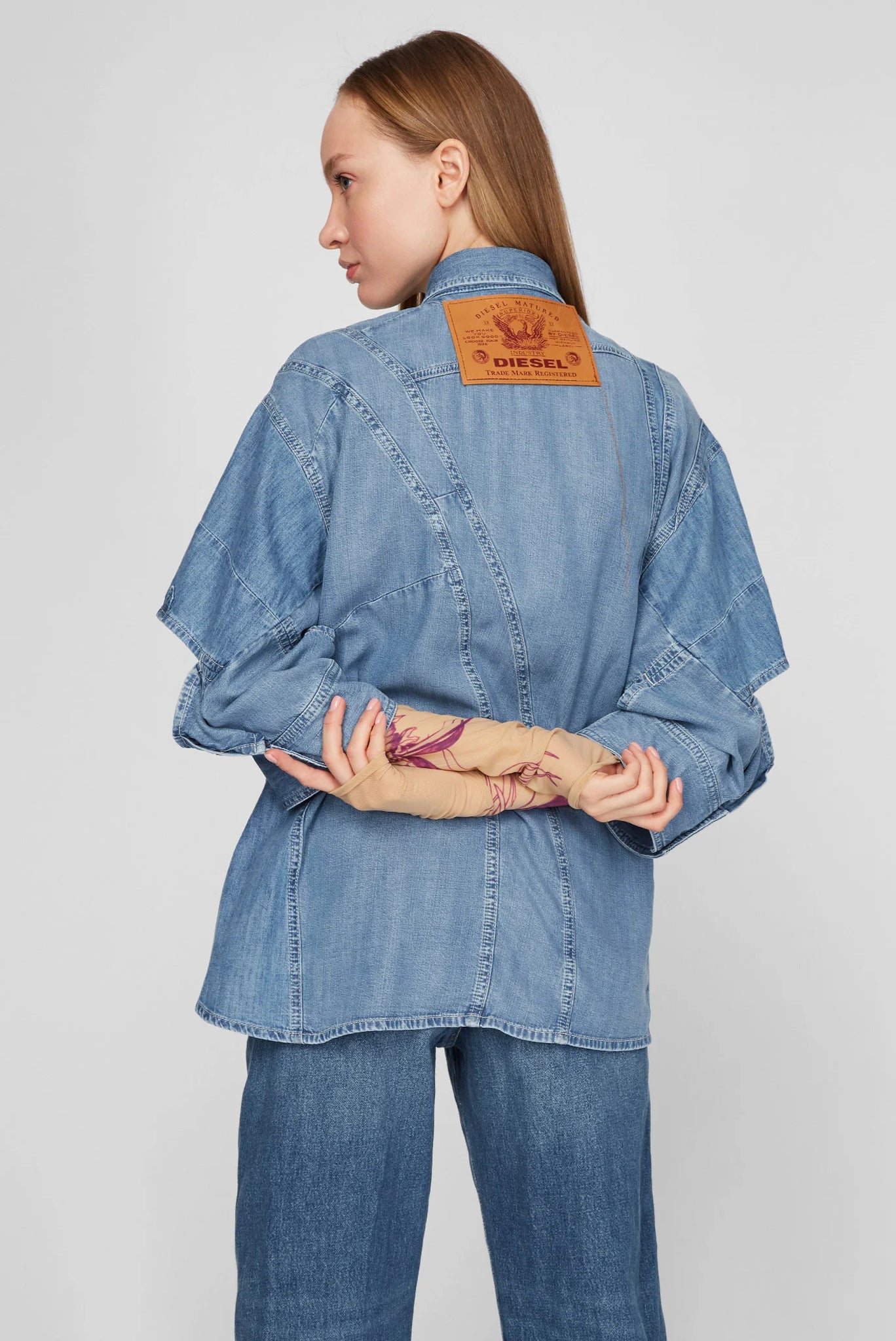 Women''s shirt by Diesel blue - logo and brand inscription on the back- button fastening- sleeves with a length of 3/4- cut out elbows- asymmetrical seams- loose fitComposition:- 61% lyocell, 39% cotton